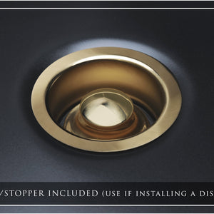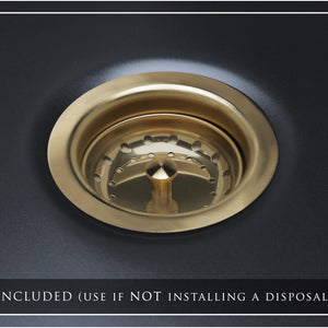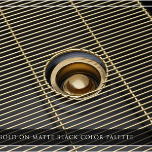 Included with this sink are three accessories: One (1) modern DESIGN-PRO sink grid, one (1) basket strainer drain, and one (1) garbage-disposal flange. For material strength, these accessories are made from 304 stainless steel, and finished in Matte Gold. Our Matte Gold finish is similar to “champaign bronze”, leaning lighter in color than a bold gold hue. When new, the plating of the drain and flange appears slightly shinier than the powder-coated grid, however upon use, the difference quickly fades. All Fossil Blu sink accessories carry a limited one-year warranty.