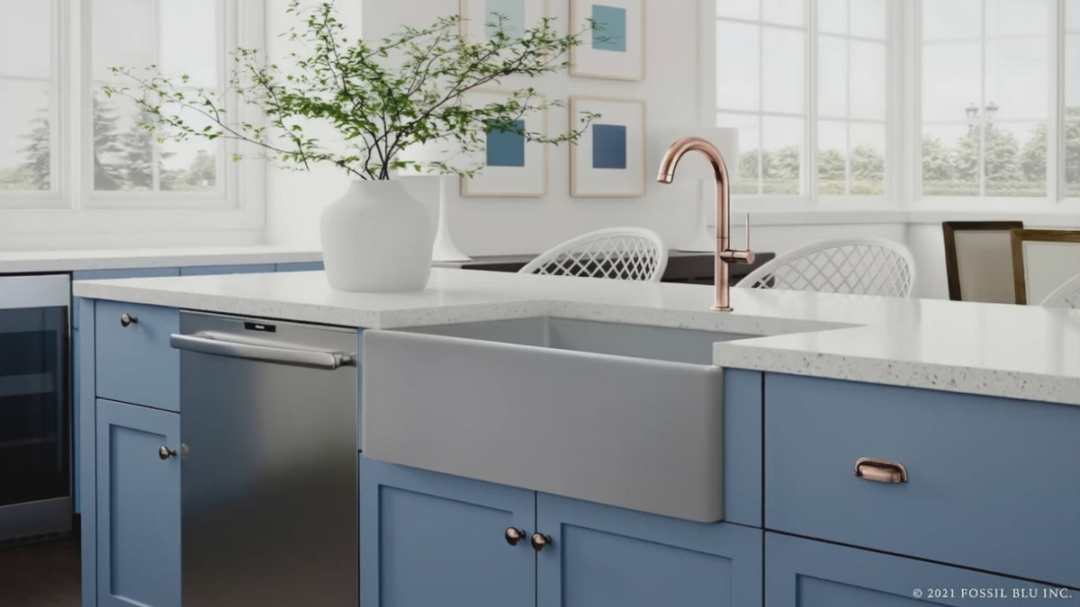 Fossil Blu fireclay sinks are designed with tighter corners and straighter sidewalls for a definitively up-to-date appearance. Combine this with luxurious accessories and a bold rectangular front apron, and your sink becomes the centerpiece of your remodeled kitchen.