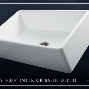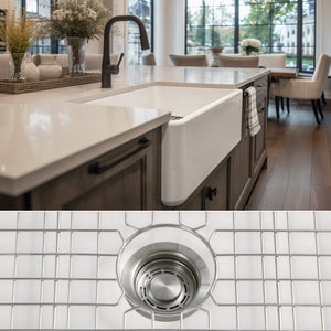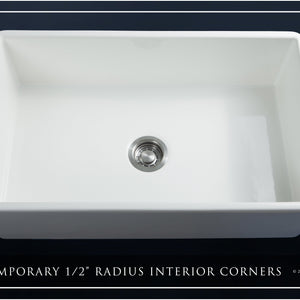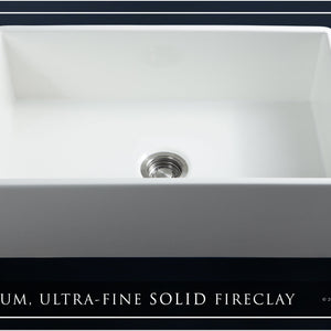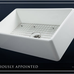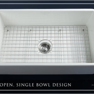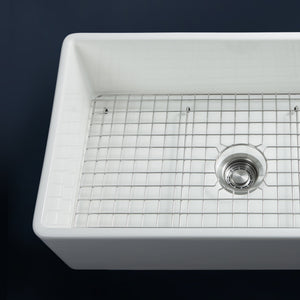 Luxury 33" x 20" compression-molded SOLID fireclay farmhouse kitchen sink. Single bowl, modern design with 1/2" radius interior corners, straight sidewalls, flat front apron, 7/8" material thickness, and glossy glaze. Classic stainless steel "checkboard" (pattern) sink grid, basket strainer-drain, and disposal flange included
