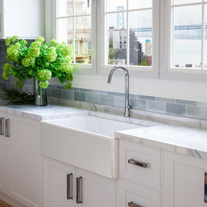 Our most popular choice for the sink apron, Fossil Blu’s flat-front fireclay farmhouse sinks provide a clean and classic look to updated kitchens. With no imprint, the rectangular shape is itself the design... a muted elegance, allowing for other kitchen elements to share the spotlight. Our flat-front fireclay sinks feature soft edges and a supple appearance to the front, characteristic of the natural fireclay material underneath. At 7/8” thickness, it presents as a contemporary sink and is therefore a neutral fit in a variety of kitchen themes. The left and right sides of the sink are fully finished, allowing for any install depth. We generally recommend 1-1/2” to 2” of the sink to be exposed on the left and right sides.
