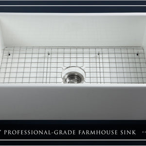 FSW1002 LUXURY 33-INCH SOLID FIRECLAY FARMHOUSE SINK IN WHITE, STAINLESS STEEL ACCS, FLAT FRONT