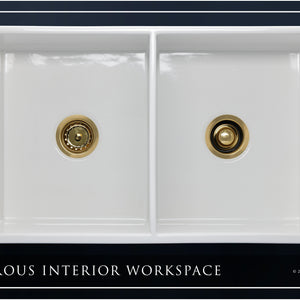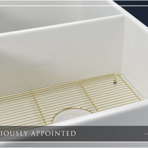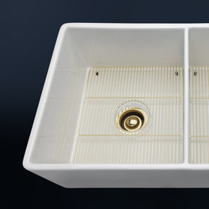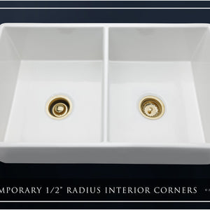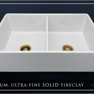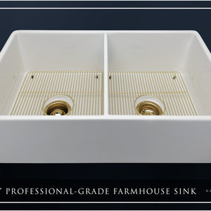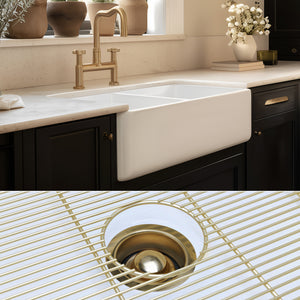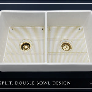 Luxury 33" x 20" compression-molded SOLID fireclay farmhouse kitchen sink. 50/50 Double bowl, modern design with 1/2" radius interior corners, straight sidewalls, flat front apron, 7/8" material thickness, and glossy glaze. Elegant matte gold "linear" (pattern) sink grids, basket strainer-drains, and disposal flanges included