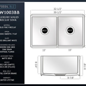 FSW1003BB LUXURY 33-INCH SOLID FIRECLAY FARMHOUSE SINK IN WHITE, MATTE GOLD ACCS, FLAT FRONT