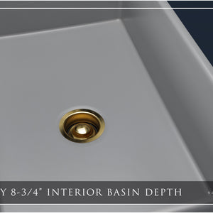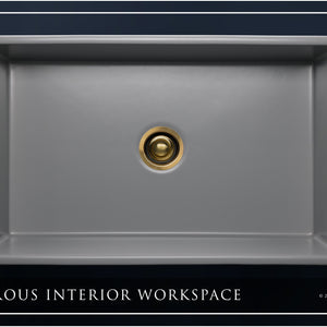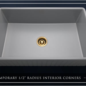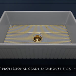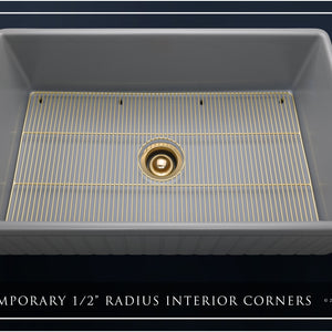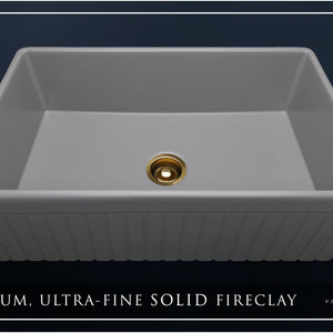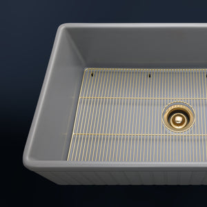 Luxury 33" x 20" compression-molded SOLID fireclay farmhouse kitchen sink in MATTE GRAY. Single bowl, modern design with 1/2" radius interior corners, straight sidewalls, fluted front apron, 7/8" material thickness, and matte glaze. Elegant matte gold "linear" (pattern) sink grid, basket strainer-drain, and disposal flange included
