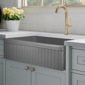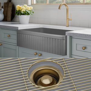 FSW1047BB LUXURY 33-INCH SOLID FIRECLAY FARMHOUSE SINK, MATTE GRAY, MATTE GOLD ACCS, FLUTED FRONT