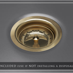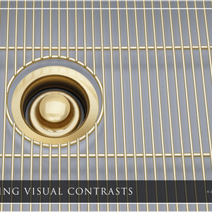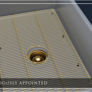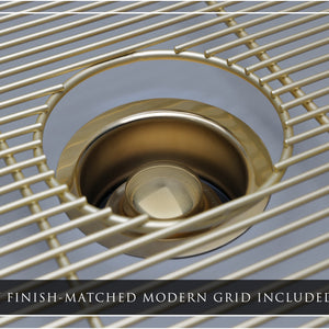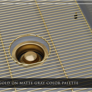 Included with this sink are three accessories: One (1) modern DESIGN-PRO sink grid, one (1) basket strainer drain, and one (1) garbage-disposal flange. For material strength, these accessories are made from 304 stainless steel, and finished in Matte Gold. Our Matte Gold finish is similar to “champaign bronze”, leaning lighter in color than a bold gold hue. When new, the plating of the drain and flange appears slightly shinier than the powder-coated grid, however upon use, the difference quickly fades. All Fossil Blu sink accessories carry a limited one-year warranty.