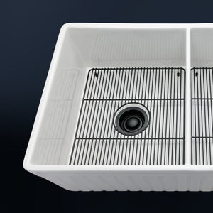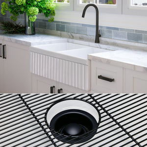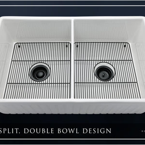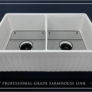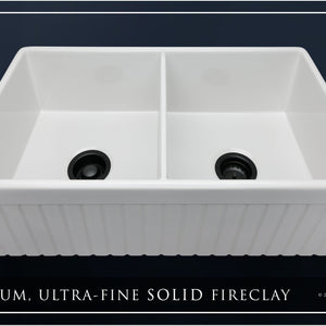 Luxury 33" x 20" compression-molded SOLID fireclay farmhouse kitchen sink. 50/50 Double bowl, modern design with 1/2" radius interior corners, straight sidewalls, fluted front apron, 7/8" material thickness, and glossy glaze. Elegant matte black "linear" (pattern) sink grid, basket strainer-drain, and disposal flange included