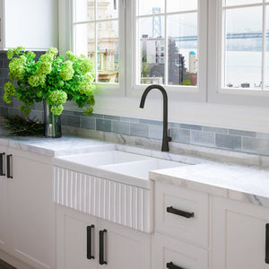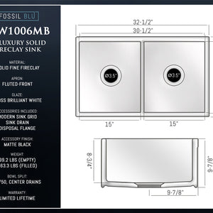 FSW1006MB LUXURY 33-INCH SOLID FIRECLAY FARMHOUSE SINK IN WHITE, MATTE BLACK ACCS, FLUTED FRONT