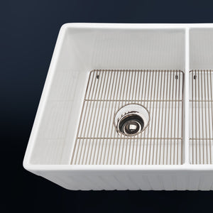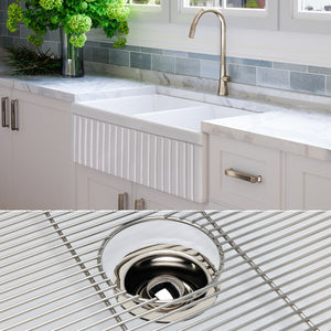 FSW1006PN LUXURY 33-INCH SOLID FIRECLAY FARMHOUSE SINK IN WHITE, POLISHED NICKEL ACCS, FLUTED FRONT