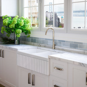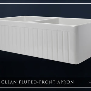 Turn-of-the-century farm sinks nearly always included a design on the front apron. The most common of which was a vertically grooved (fluted) imprint. Today, as the “Modern Farmhouse” trend has taken storm, the majority of new farmhouse sinks sold feature a simple, flat-front, modern apron. However, for those seeking something more, Fossil Blu’s 1.5” beaded shaker style of this fluted-front sink offers a blend of antique styling with a contemporary appeal. The design is crisp, yet features soft edges and a supple appearance to the front, characteristic of the natural fireclay material underneath. At 1-1/8” thickness, the apron presents as a bold, sophisticated sink and, much like shaker cabinet fronts, is a good fit in a variety of classic stylistic themes. The left and right sides of the sink are fully finished, allowing for any install depth. We generally recommend 1-1/2” to 2” of the sink to be exposed on the left and right sides.