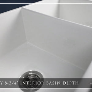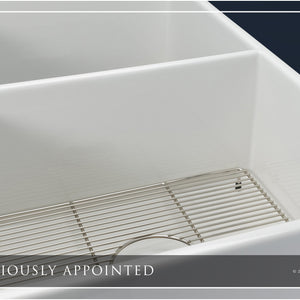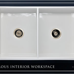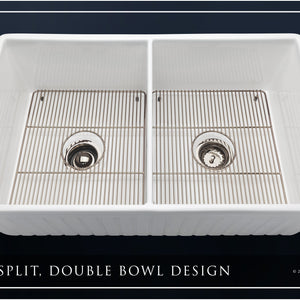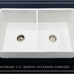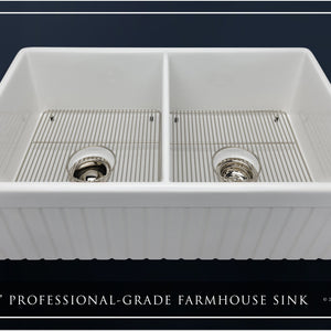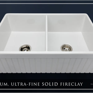 Luxury 33" x 20" compression-molded SOLID fireclay farmhouse kitchen sink. 50/50 Double bowl, modern design with 1/2" radius interior corners, straight sidewalls, fluted front apron, 7/8" material thickness, and glossy glaze. Elegant polished nickel "linear" (pattern) sink grids, basket strainer-drains, and disposal flanges included