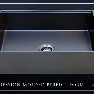 Luxury 33" x 20" compression-molded SOLID fireclay workstation apron-front kitchen sink in MATTE BLACK. Single bowl, modern design with 1/2" radius interior corners, straight sidewalls, flat front apron, 1" material thickness, and glossy glaze. Topside accessories include a roll-out drying mat and slotted bamboo cutting board. Elegant polished nickel "linear" (pattern), basket strainer-drain, and disposal flange basin accessories finish out the package.