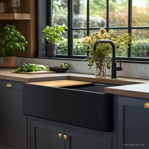 Our most popular choice for the sink apron, Fossil Blu’s flat-front fireclay farmhouse sinks provide a clean and classic look to updated kitchens. With no imprint, the rectangular shape is itself the design... a muted elegance, allowing for other kitchen elements to share the spotlight. Our flat-front fireclay sinks feature soft edges and a supple appearance to the front, characteristic of the natural fireclay material underneath. At 1” thickness, it presents as a contemporary sink and is therefore a neutral fit in a variety of kitchen themes. The left and right sides of the sink are fully finished, allowing for any install depth. We generally recommend 1-1/2” to 2” of the sink to be exposed on the left and right sides.