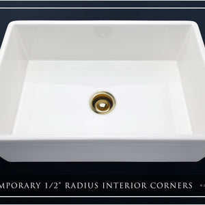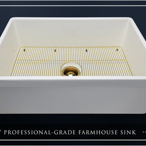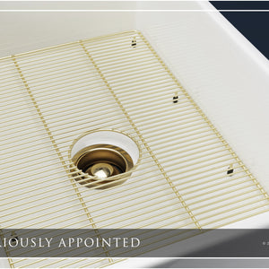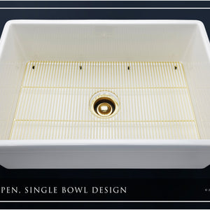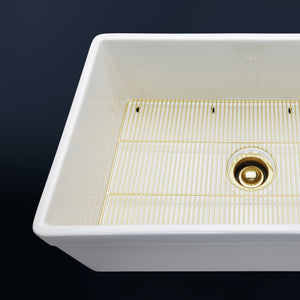 Luxury 30" x 20" compression-molded SOLID fireclay farmhouse kitchen sink. Single bowl, modern design with 1/2" radius interior corners, straight sidewalls, belted front apron, 7/8" material thickness, and glossy glaze. Elegant matte gold "linear" (pattern) sink grid, basket strainer-drain, and disposal flange included