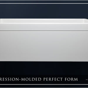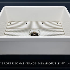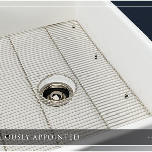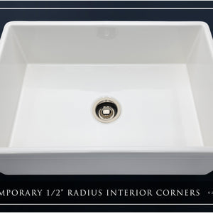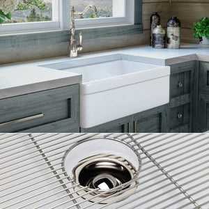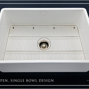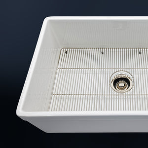 Luxury 30" x 20" compression-molded SOLID fireclay farmhouse kitchen sink. Single bowl, modern design with 1/2" radius interior corners, straight sidewalls, belted front apron, 7/8" material thickness, and glossy glaze. Elegant polished nickel "linear" (pattern) sink grid, basket strainer-drain, and disposal flange included