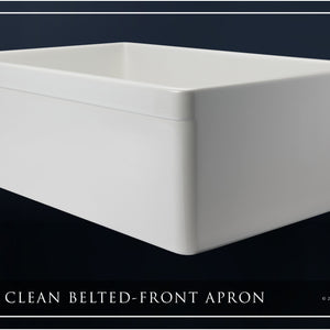 Turn-of-the-century farm sinks nearly always included a design on the front apron. The most common of which was a vertically grooved (fluted) imprint. Today, as the “Modern Farmhouse” trend has taken storm, the majority of new farmhouse sinks sold feature a simple, flat-front, modern apron. However, for those seeking something more, Fossil Blu’s 2” cap-stone style belted sink offers a stately touch to an otherwise flat-front apron. The design is crisp, yet features soft edges and a supple appearance to the front, characteristic of the natural fireclay material underneath. At 1-1/8” thickness, the apron presents as a bold, sophisticated sink and, much like shaker cabinet fronts, is a good fit in a variety of classic stylistic themes. The left and right sides of the sink are fully finished, allowing for any install depth. We generally recommend 1-1/2” to 2” of the sink to be exposed on the left and right sides.