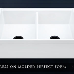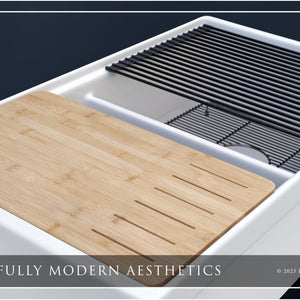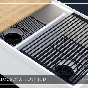 Luxury 33" x 20" compression-molded SOLID fireclay workstation apron-front kitchen sink. 50/50 double bowl, modern design with 1/2" radius interior corners, straight sidewalls, belted front apron, 1" material thickness, and glossy glaze. Topside accessories include a roll-out drying mat and slotted bamboo cutting board. Elegant matte black "linear" (pattern), basket strainer-drain, and disposal flange basin accessories finish out the package.