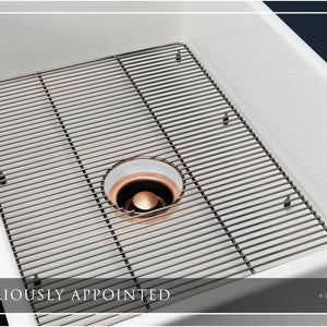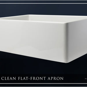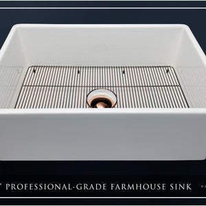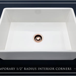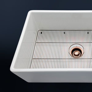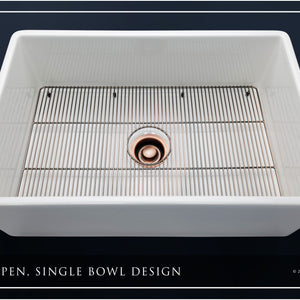 Luxury 30" x 20" compression-molded SOLID fireclay farmhouse kitchen sink. Single bowl, modern design with 1/2" radius interior corners, straight sidewalls, flat front apron, 7/8" material thickness, and glossy glaze. Elegant antique copper "linear" (pattern) sink grid, basket strainer-drain, and disposal flange included