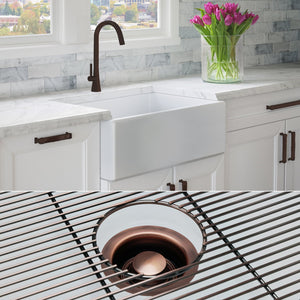 Included with this sink are three accessories: One (1) modern DESIGN-PRO sink grid, one (1) basket strainer drain, and one (1) garbage-disposal flange. For material strength, these accessories are made from 304 stainless steel, and finished in Antique Copper (pairs very well with bronze fixtures, including oil-rubbed bronze). To apply this finish, we first plate the stainless steel with copper before then applying a veil of black powder coating. After light brushing, the copper finish displays an antiqued look, which leans more toward dark tones than brighter copper tones. This is intentionally done so as to compliment both copper and bronze tones. All Fossil Blu sink accessories carry a limited one-year warranty.