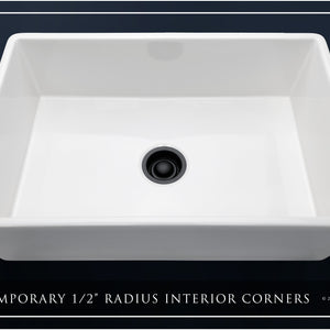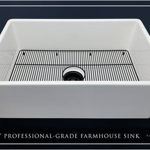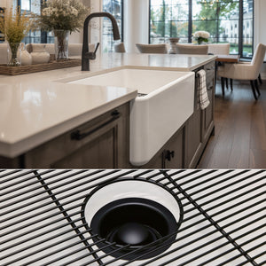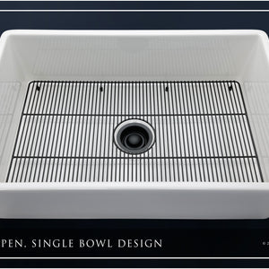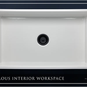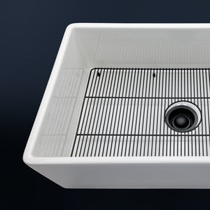 Luxury 33" x 20" compression-molded SOLID fireclay farmhouse kitchen sink. Single bowl, modern design with 1/2" radius interior corners, straight sidewalls, flat front apron, 7/8" material thickness, and glossy glaze. Elegant matte black "linear" (pattern) sink grid, basket strainer-drain, and disposal flange included