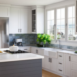Fossil Blu fireclay sinks are designed with tighter corners and straighter sidewalls for a definitively up-to-date appearance. Combine this with luxurious accessories and a bold rectangular front apron, and your sink becomes the centerpiece of your remodeled kitchen.