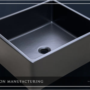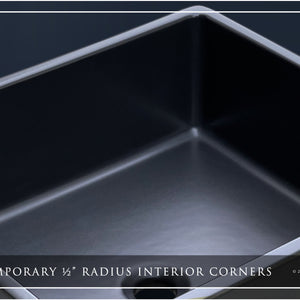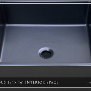 This sink features Fossil Blu’s legendary silica-based glaze, which is robotically applied, allowing for up to twice the glaze thickness compared to hand-sprayed glazing techniques. Fired (kilned) at over 2200-degrees Fahrenheit, the glaze fuses with the fireclay substrate to create a permanent enamel (Learn more about glaze fusing above). This low-gloss (between eggshell & matte) enamel has a very high hardness rating, which means it is non-porous and nearly indestructible. Standard household cleaners and mild abrasives (including bleach and Bar-Keeper’s Friend) are safe to use in moderation. Our Matte Black finish is similar to Black Onyx (sometimes called Gem Tones). RGB value averages are as follows: R: 47, G: 48, B: 50. The consistent RGB values of our finish means the black color has neither a warm nor cool tint. Perfect Black RGB values are each 0 and Perfect White RGB values are each 255. The 47-50 RGB values of our black finish means that it is very dark, but soft in appearance.