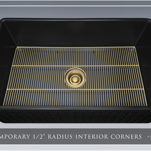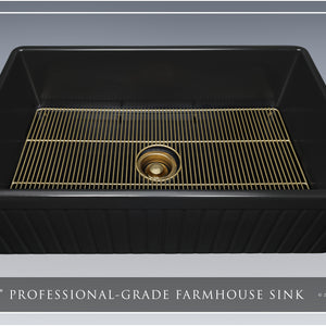 Luxury 33" x 20" compression-molded SOLID fireclay farmhouse kitchen sink in MATTE BLACK. Single bowl, modern design with 1/2" radius interior corners, straight sidewalls, fluted front apron, 7/8" material thickness, and matte glaze. Elegant matte gold "linear" (pattern) sink grid, basket strainer-drain, and disposal flange included