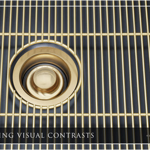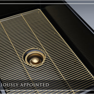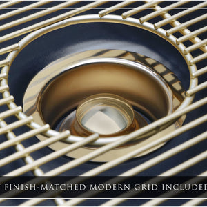 Included with this sink are three accessories: One (1) modern DESIGN-PRO sink grid, one (1) basket strainer drain, and one (1) garbage-disposal flange. For material strength, these accessories are made from 304 stainless steel, and finished in Matte Gold. Our Matte Gold finish is similar to “champaign bronze”, leaning lighter in color than a bold gold hue. When new, the plating of the drain and flange appears slightly shinier than the powder-coated grid, however upon use, the difference quickly fades. All Fossil Blu sink accessories carry a limited one-year warranty.