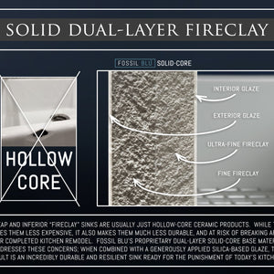 Cheap and inferior "fireclay" sinks are usually just hollow-core ceramic products.  When you buy Fossil Blu, you're buying authenticity and long-term durability. Our SOLID dual-layer fine and ultra-fine base material makes for an incredibly resilient sink.