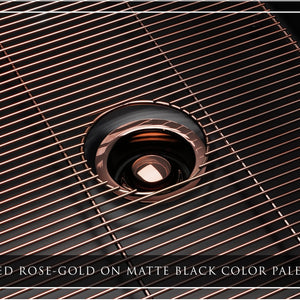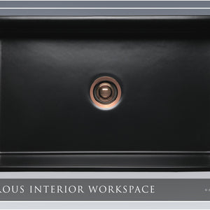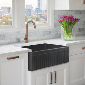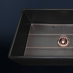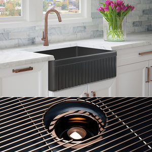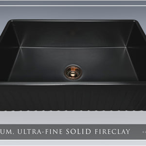 FSW1027RG LUX 33-INCH SOLID FIRECLAY FARMHOUSE SINK, MATTE BLACK, POL. ROSE GOLD ACCS, FLUTED FRONT
