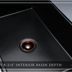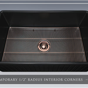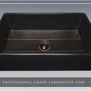 Luxury 33" x 20" compression-molded SOLID fireclay farmhouse kitchen sink in MATTE BLACK. Single bowl, modern design with 1/2" radius interior corners, straight sidewalls, fluted front apron, 7/8" material thickness, and matte glaze. Elegant polished rose gold "linear" (pattern) sink grid, basket strainer-drain, and disposal flange included
