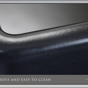 This sink features Fossil Blu’s legendary silica-based glaze, which is robotically applied, allowing for up to twice the glaze thickness compared to hand-sprayed glazing techniques. Fired (kilned) at over 2200-degrees Fahrenheit, the glaze fuses with the fireclay substrate to create a permanent enamel (Learn more about glaze fusing above). This low-gloss (between eggshell & matte) enamel has a very high hardness rating, which means it is non-porous and nearly indestructible. Standard household cleaners and mild abrasives (including bleach and Bar-Keeper’s Friend) are safe to use in moderation. Our Matte Black finish is similar to Black Onyx (sometimes called Gem Tones). RGB value averages are as follows: R: 47, G: 48, B: 50. The consistent RGB values of our finish means the black color has neither a warm nor cool tint. Perfect Black RGB values are each 0 and Perfect White RGB values are each 255. The 47-50 RGB values of our black finish means that it is very dark, but soft in appearance.