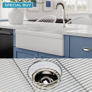 Luxury 33" x 20" compression-molded SOLID fireclay farmhouse kitchen sink. 50/50 Double bowl, modern design with 1/2" radius interior corners, straight sidewalls, belted front apron, 7/8" material thickness, and glossy glaze. Elegant polished nickel "linear" (pattern) sink grids, basket strainer-drains, and disposal flanges included