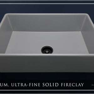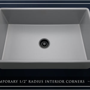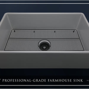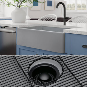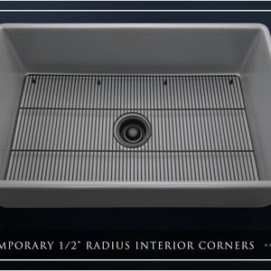 Luxury 33" x 20" compression-molded SOLID fireclay farmhouse kitchen sink in MATTE GRAY. Single bowl, modern design with 1/2" radius interior corners, straight sidewalls, flat front apron, 7/8" material thickness, and matte glaze. Elegant matte black "linear" (pattern) sink grid, basket strainer-drain, and disposal flange included