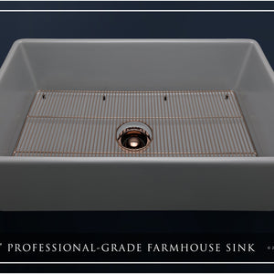 Luxury 33" x 20" compression-molded SOLID fireclay farmhouse kitchen sink in MATTE GRAY. Single bowl, modern design with 1/2" radius interior corners, straight sidewalls, flat front apron, 7/8" material thickness, and matte glaze. Elegant polished rose gold "linear" (pattern) sink grid, basket strainer-drain, and disposal flange included