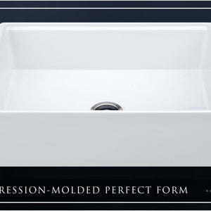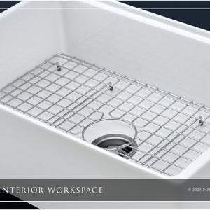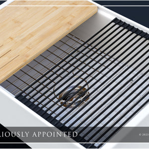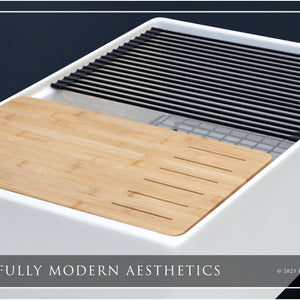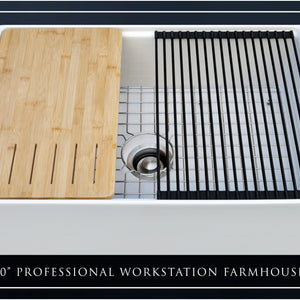 Luxury 33" x 20" compression-molded SOLID fireclay workstation apron-front kitchen sink. Single bowl, modern design with 1/2" radius interior corners, straight sidewalls, flat front apron, 1" material thickness, and glossy glaze. Topside accessories include a roll-out drying mat and slotted bamboo cutting board. Classic stainless steel sink grid, basket strainer-drain, and disposal flange basin accessories finish out the package.