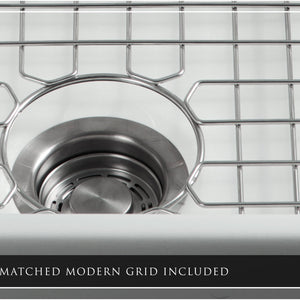 Included with this sink are five accessories: One (1) Bamboo cutting board, one (1) silicone dish drying rack, one (1) custom-fitted sink grid, one (1) basket strainer drain, and one (1) garbage-disposal flange.