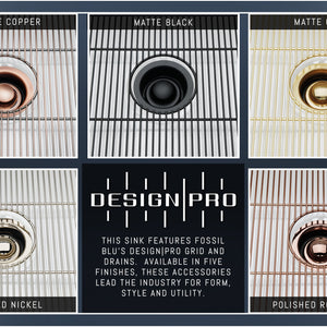 Available in six finishes, only Fossil Blu allows you to match your sink basin accessories to the hardware color motif of your kitchen. Choose from Antique Copper (pairs well with Oil Rubbed Bronze), Matte Black, Matte Gold (similar to Matte Brass or "Champagne Bronze"), Polished Nickel, Polished Rose Gold, or our classic Stainless Steel in a checkerboard pattern.