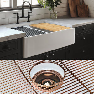 Included with this sink are five accessories: One (1) Bamboo cutting board, one (1) silicone dish drying rack, two (2) custom-fitted sink grids, one (1) basket strainer drain, and one (1) garbage-disposal flange.