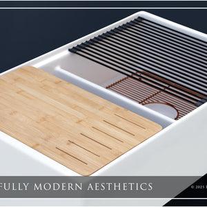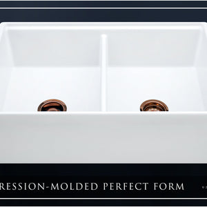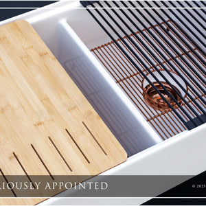 Luxury 33" x 20" compression-molded SOLID fireclay workstation apron-front kitchen sink. 50/50 double bowl, modern design with 1/2" radius interior corners, straight sidewalls, flat front apron, 1" material thickness, and glossy glaze. Topside accessories include a roll-out drying mat and slotted bamboo cutting board. Elegant polished rose gold "linear" (pattern), basket strainer-drain, and disposal flange basin accessories finish out the package.