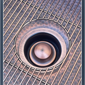 Included with this sink are two accessories: One (1) custom-fitted sink grid, and one (1) garbage-disposal flange. For material strength, these accessories are made from 304 stainless steel, and finished in Antique Copper. To achieve this finish, we first plate the stainless steel with copper before then applying a veil of black powder coating. After light brushing, the copper finish displays an antiqued look, which leans more toward dark tones than brighter copper tones. The darker overall appearance is done so intentionally to be neutral against the tones of the sink. This, along with the neutral appearance of our checkerboard grid, allow the sink to remain the focus, not the accessories. As a plated and powder coated finish (as opposed to painted or vinyl coated), it is incredibly durable.