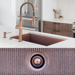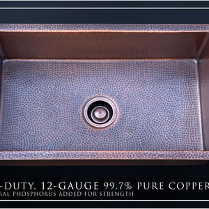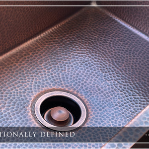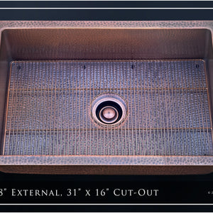 Luxury 33-Inch Copper Undermount Kitchen Sink, Heavy 12-Gauge Copper, Hammered, Dark Antique Finish, Single Bowl. Fossil Blu copper sinks are DISPOSAL READY with included copper-plated 304 stainless disposal flange and stopper. Also included with each sink is a CUSTOM-FITTED copper-plated 304 stainless basin rack (sink grid) capable of supporting up to 200 LBS of dishes.