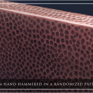 This sink features a mottled finish, characteristic of the natural oxidation, or patina, of copper. Our copper sinks start as raw (semi-shiny) copper, and remain as such throughout manufacturing and hammering. Upon completion of production, we soak each sink in a non-toxic solution similar to household vinegar, which once removed and exposed to oxygen in the air, rapidly oxidizes the metal. At the correct time interval, we apply a torch to the metal to quickly dry the sink and neutralize the process. The umber-colored patina has been formed. Next, using a buffing machine with a mild scouring pad, we remove most of the patina from the ridges of the hammer marks, while the valleys retain most of the umber hues. Last, we apply non-toxic carnauba wax to seal the copper and patina.