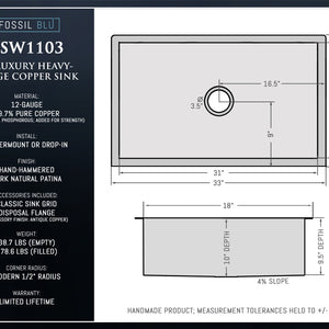 Dish washing isn’t as much of a chore when there is a sense of pride while standing at your sink. As the largest copper sinks we sell, Fossil Blu 33-inch copper undermount sinks are not only gorgeous, but offer one of the largest interior workspaces available for the 33” class of undermount sinks. Whether you like to entertain guests, have a large family, or simply want as a big of a sink as your kitchen plans allow, look no further. With 31” x 16” interior dimensions, this sink boasts nearly 500 square inches of surface area, easily containing even your largest pots and pans. See specification sheet (below) for spec data and dimensional line art.