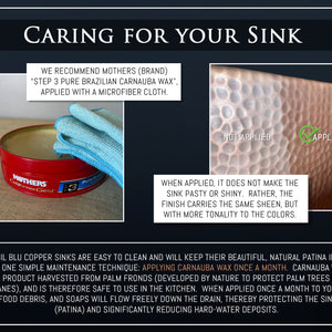 Fossil Blu copper sinks are easy to clean and will keep their beautiful, natural patina if you follow one simple maintenance technique: Applying carnauba wax once a month. Carnauba wax is a natural product harvested from palm fronds (developed by nature to protect palm trees during hurricanes), and is therefore safe to use in the kitchen. When applied once a month to your sink, water, food debris, and soaps will flow freely down the drain, thereby protecting the sink finish (patina) and significantly reducing hard-water deposits. We recommend Mothers (brand) “Step 3 Pure Brazilian Carnauba Wax”, applied with a microfiber cloth. When applied, it does not make the sink pasty or shiny. Rather, the finish carries the same sheen but with more tonality to the colors.