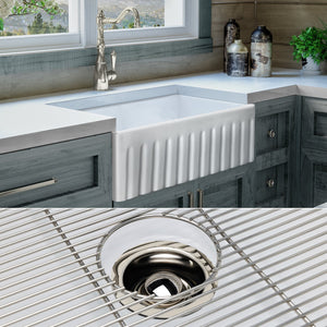 Luxury 30" x 20" compression-molded SOLID fireclay farmhouse kitchen sink. Single bowl, modern design with 1/2" radius interior corners, straight sidewalls, fluted-front apron, 7/8" material thickness, and glossy glaze. Elegant polished nickel "linear" (pattern) sink grid, basket strainer-drain, and disposal flange included