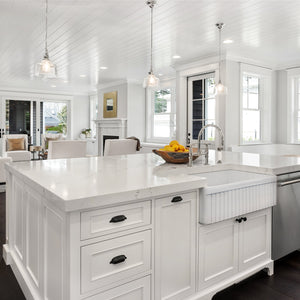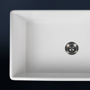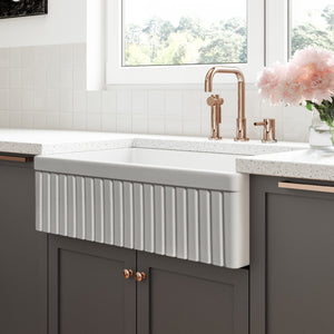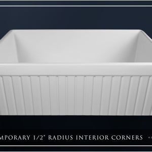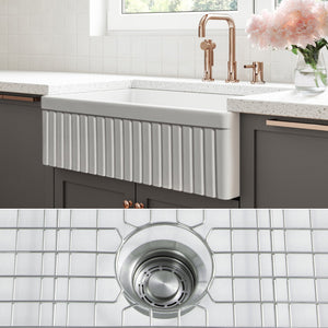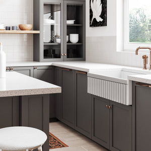 Turn-of-the-century farm sinks nearly always included a design on the front apron. The most common of which was a vertically grooved (fluted) imprint. Today, as the “Modern Farmhouse” trend has taken storm, the majority of new farmhouse sinks sold feature a simple, flat-front, modern apron. However, for those seeking something more, Fossil Blu’s 1.5” beaded shaker style of this fluted-front sink offers a blend of antique styling with a contemporary appeal. The design is crisp, yet features soft edges and a supple appearance to the front, characteristic of the natural fireclay material underneath. At 1-1/8” thickness, the apron presents as a bold, sophisticated sink and, much like shaker cabinet fronts, is a good fit in a variety of classic stylistic themes. The left and right sides of the sink are fully finished, allowing for any install depth. We generally recommend 1-1/2” to 2” of the sink to be exposed on the left and right sides.