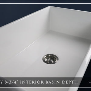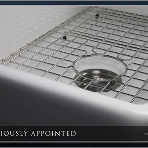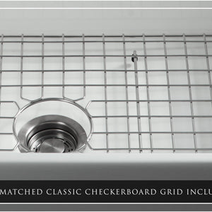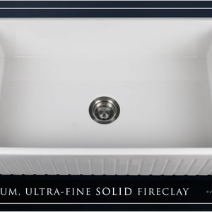 Luxury 33" x 20" compression-molded SOLID fireclay farmhouse kitchen sink. Single bowl, modern design with 1/2" radius interior corners, straight sidewalls, fluted-front apron, 7/8" material thickness, and glossy glaze. Classic stainless steel "checkboard" (pattern) sink grid, basket strainer-drain, and disposal flange included