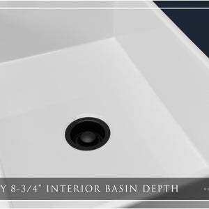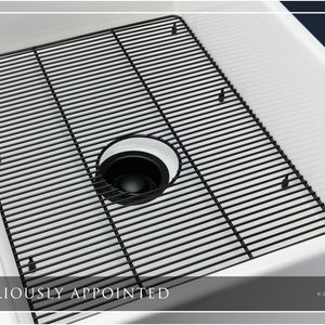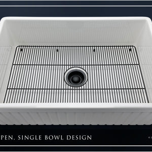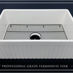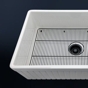 Luxury 33" x 20" compression-molded SOLID fireclay farmhouse kitchen sink. Single bowl, modern design with 1/2" radius interior corners, straight sidewalls, fluted-front apron, 7/8" material thickness, and glossy glaze. Elegant matte black "linear" (pattern) sink grid, basket strainer-drain, and disposal flange included