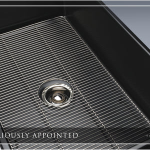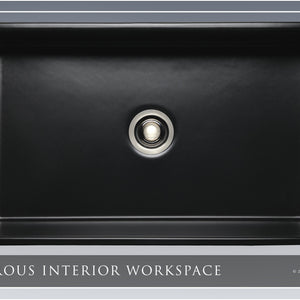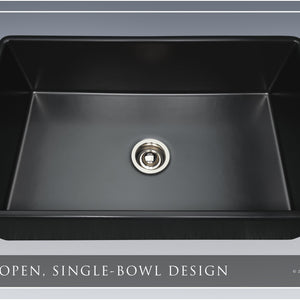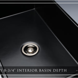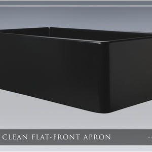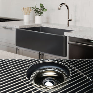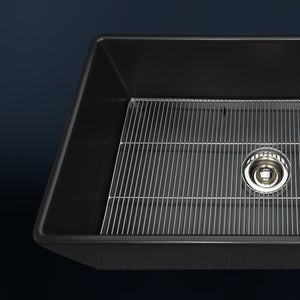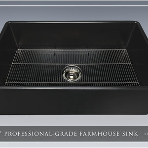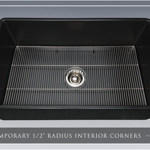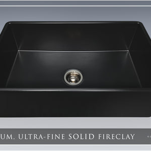 Luxury 33" x 20" compression-molded SOLID fireclay farmhouse kitchen sink in MATTE BLACK. Single bowl, modern design with 1/2" radius interior corners, straight sidewalls, flat front apron, 7/8" material thickness, and matte glaze. Elegant polished nickel "linear" (pattern) sink grid, basket strainer-drain, and disposal flange included